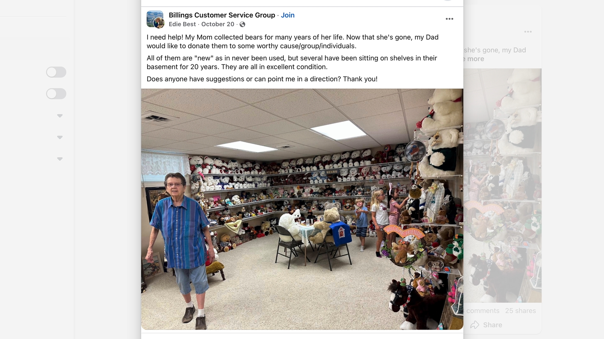 In October, Edie posted a photo of the collection on Facebook and asked for ideas on where to donate the bears. The response was immediate. Hundreds of people reached out with suggestions.